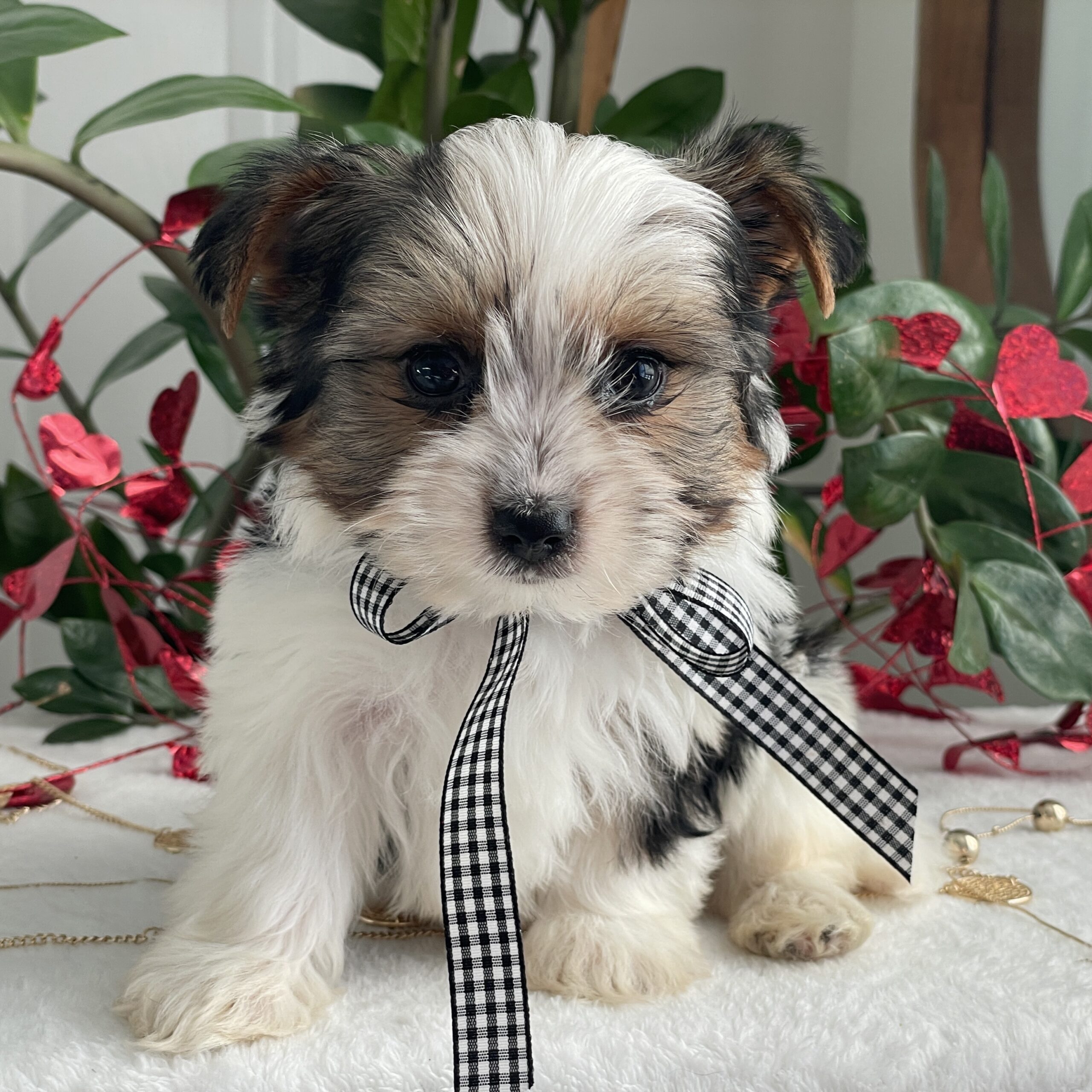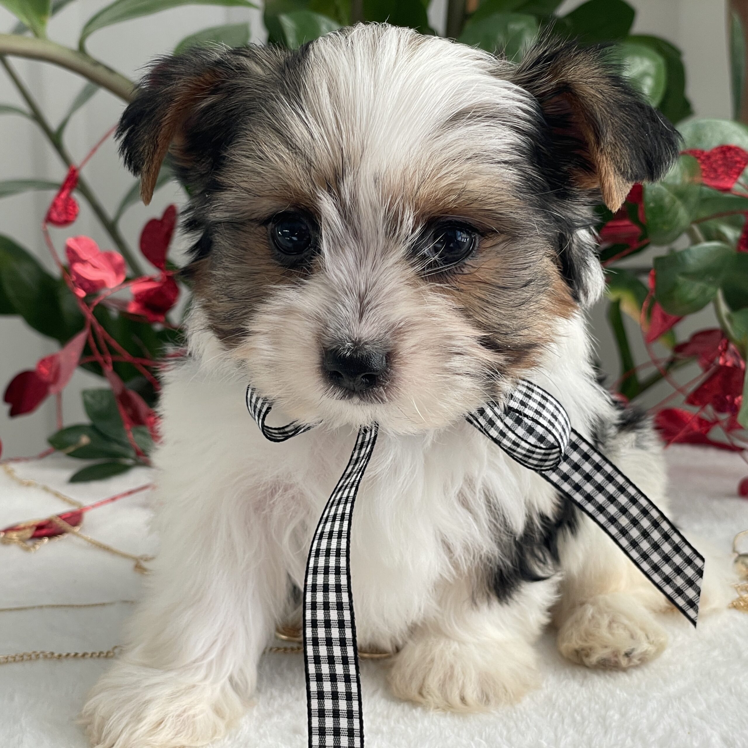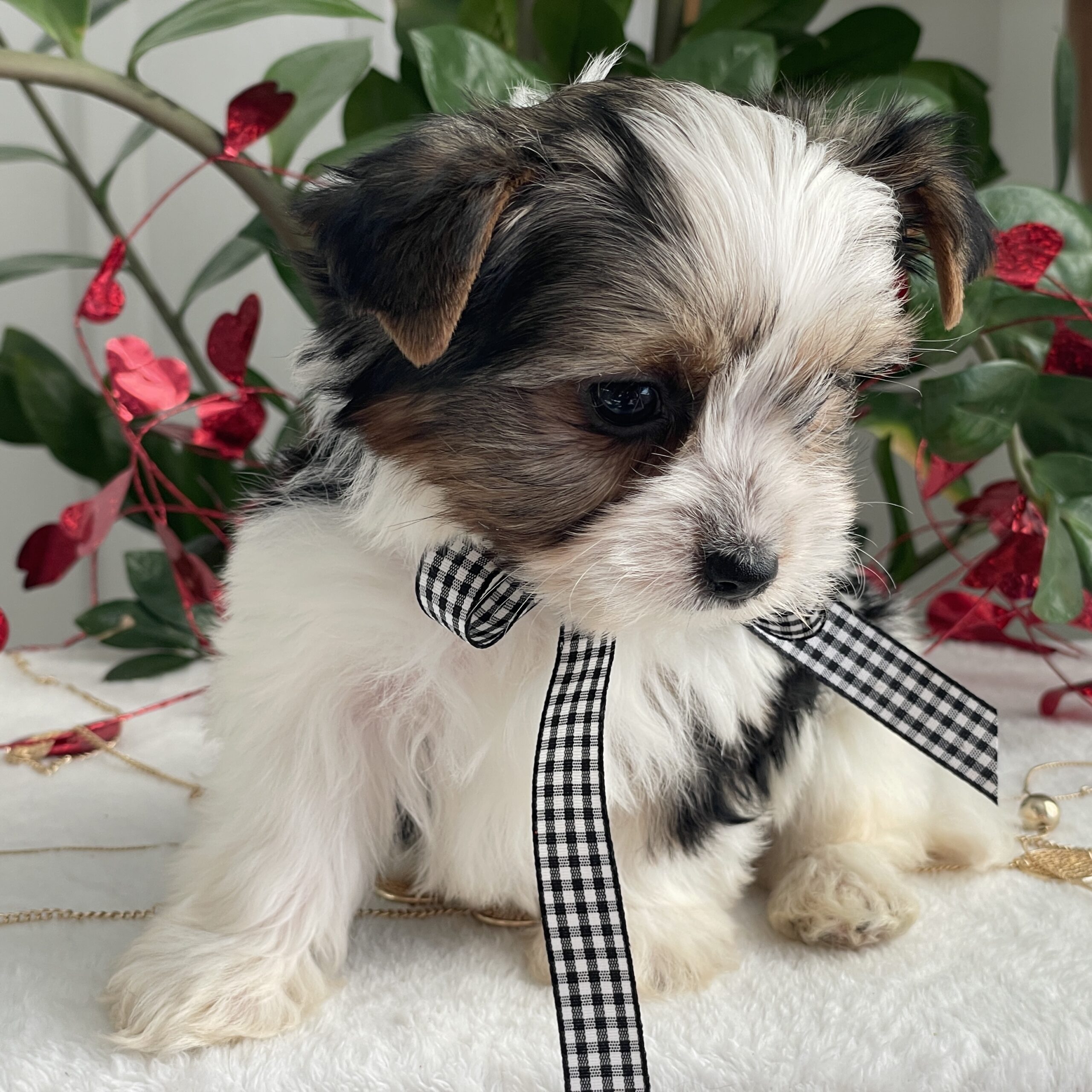 Charlie is a very calm and easy going. He is more reserved than his siblings and is a quiet little puppy. He loves laps and cuddles and will be the best little buddy in the world. He has a gorgeous coat, a sweet face and is tracking to be @ 5 lbs full grown.