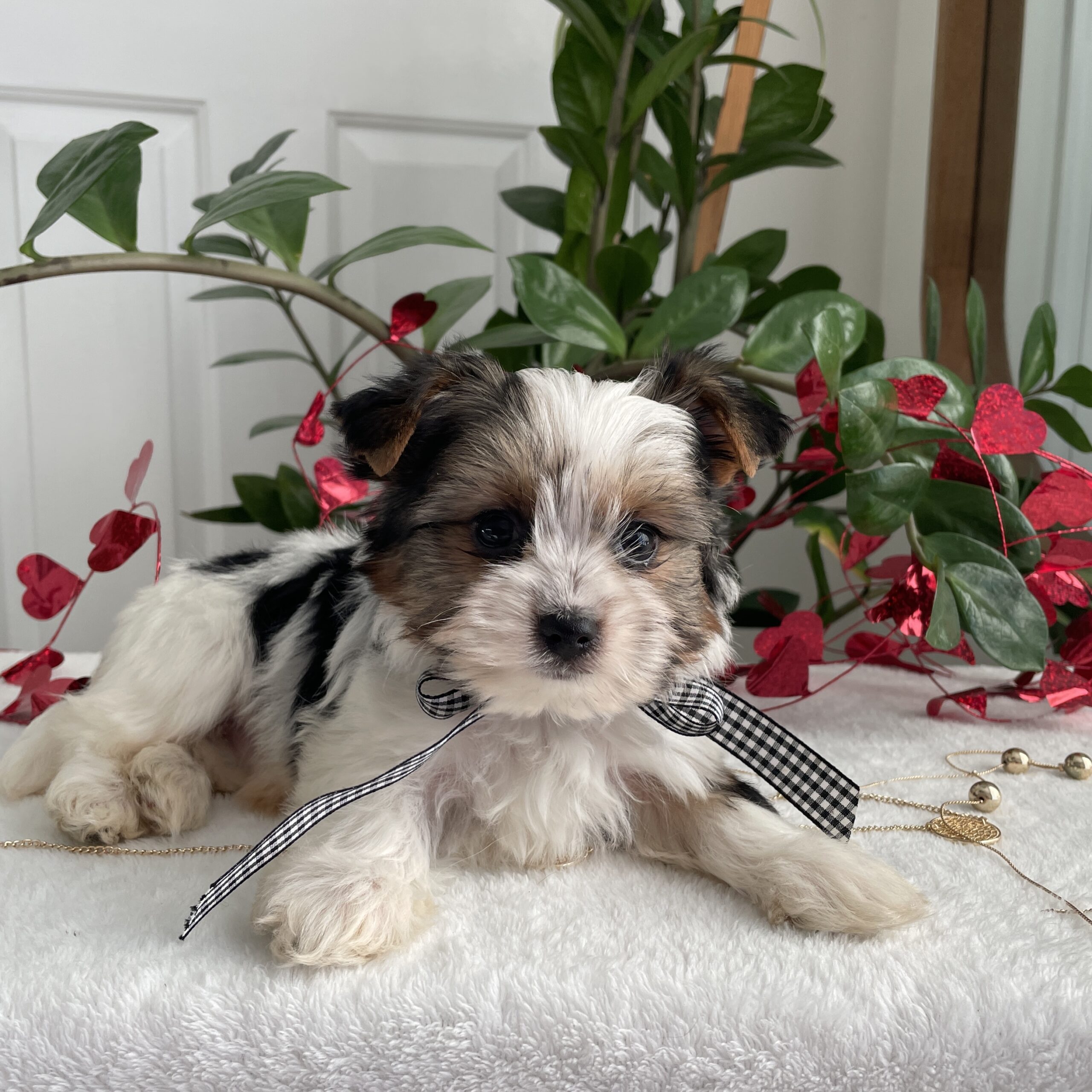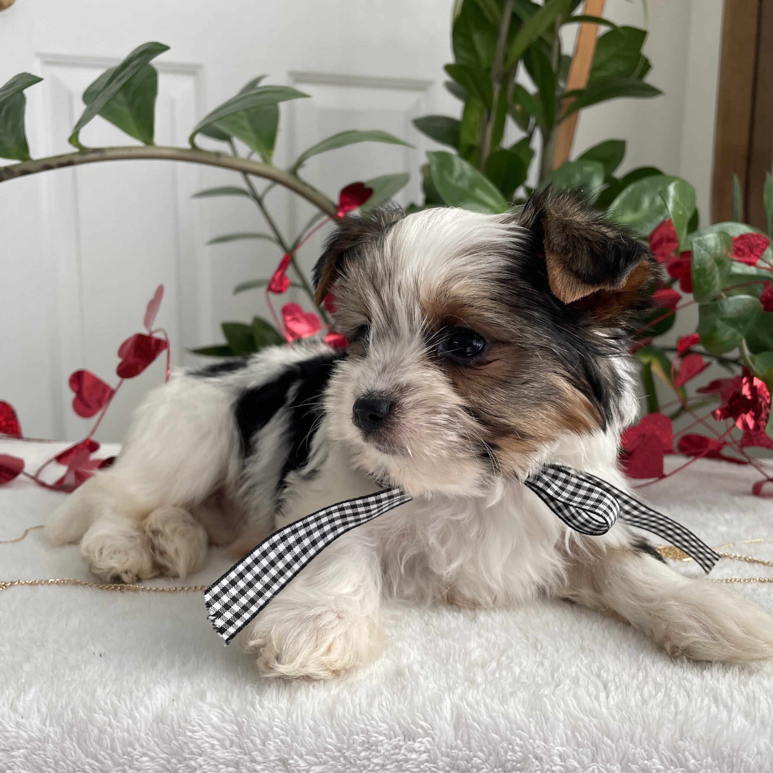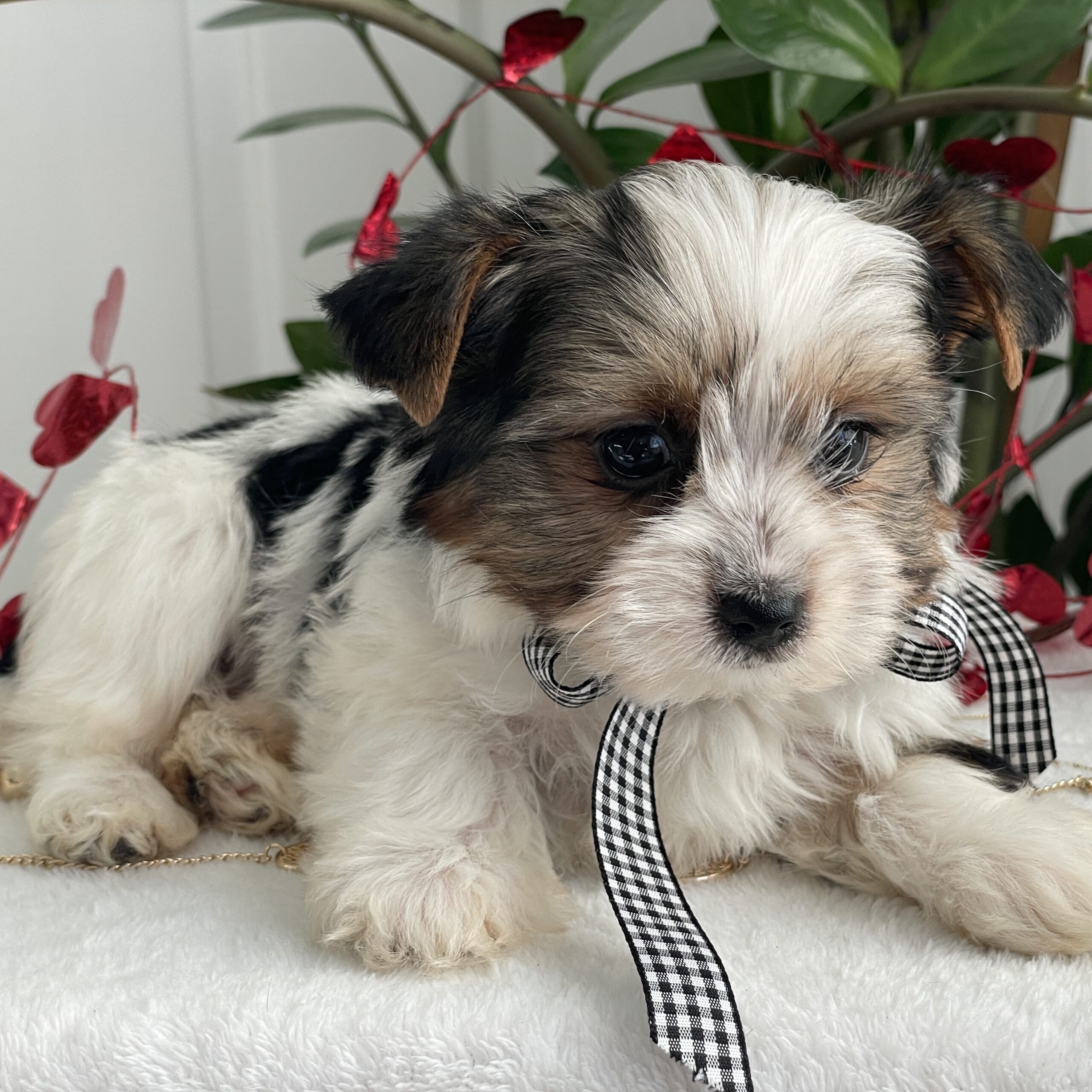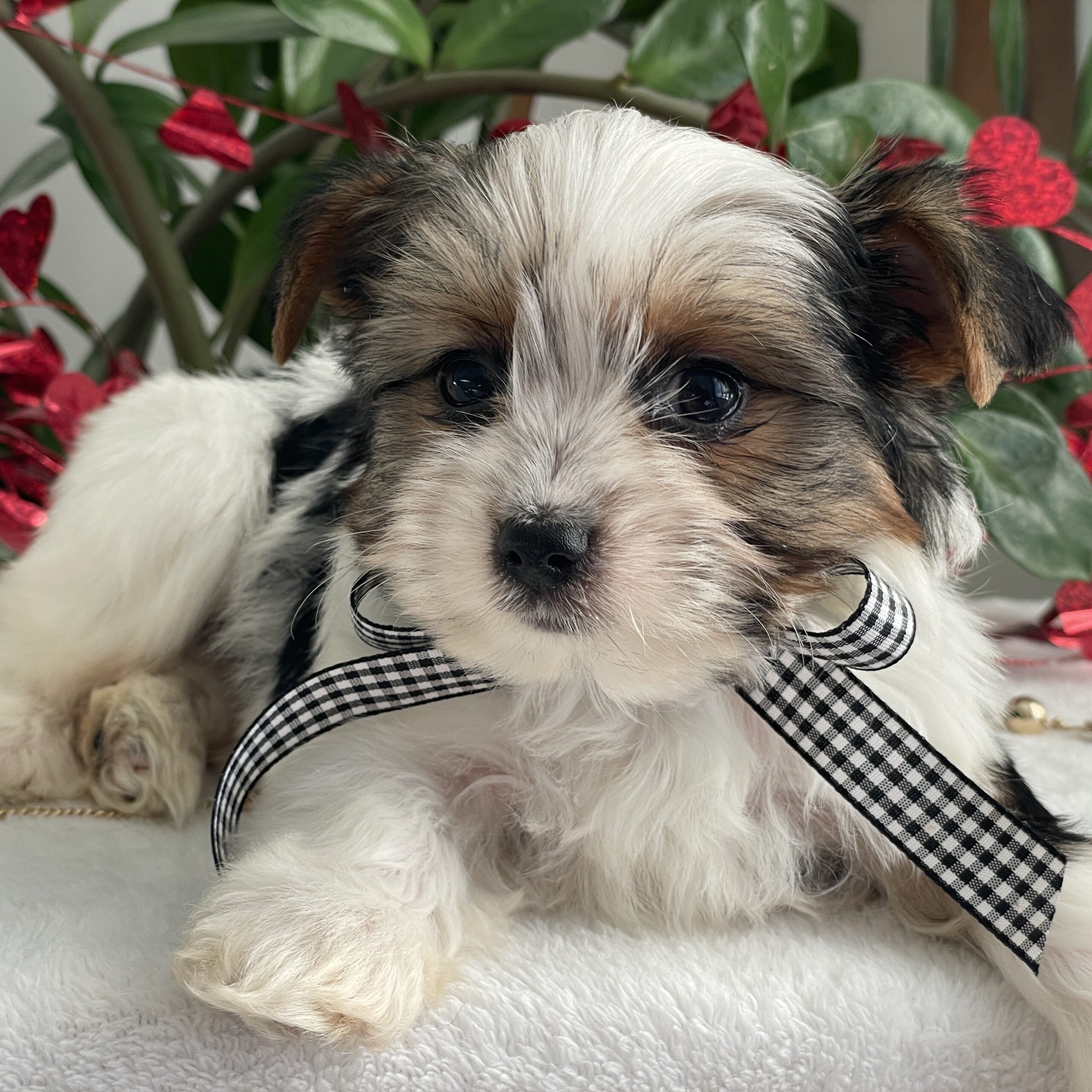 Charlie is a very calm and easy going. He is more reserved than his siblings and is a quiet little puppy. He loves laps and cuddles and will be the best little buddy in the world. He has a gorgeous coat, a sweet face and is tracking to be @ 5 lbs full grown.