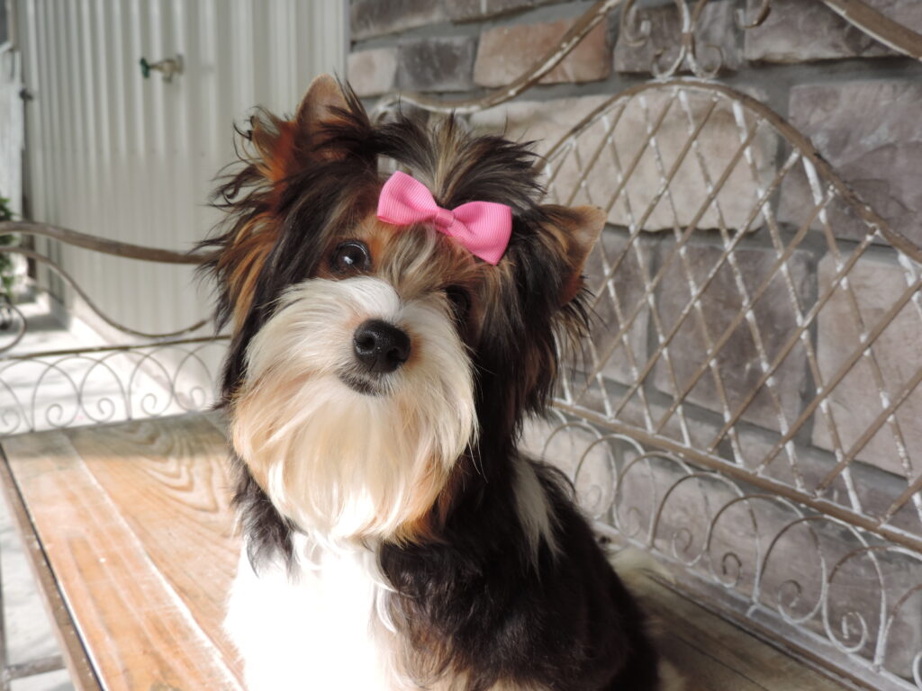 Marty is a bigger Biewer Yorkie and is gentle and easy going. He loves cuddles and will happily hang out in your lap. We are expecting him to be 8-10 lbs full grown. So if you want a great family dog and love to go walking, he will be a wonderful walking buddy. He has such a beautiful coat…so thick, full and soft. You can’t go wrong on this little guy!