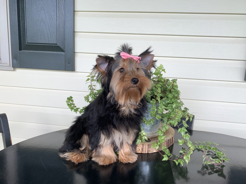 Mia is tiny little handful of a puppy. She is sugar sweet and calm and easy going. She will cuddle into crook of your arm and just love to hang out there. I just love her sweet face and pleasant personality. If you are looking for a chill little puppy to hang with, then this is the one for you.